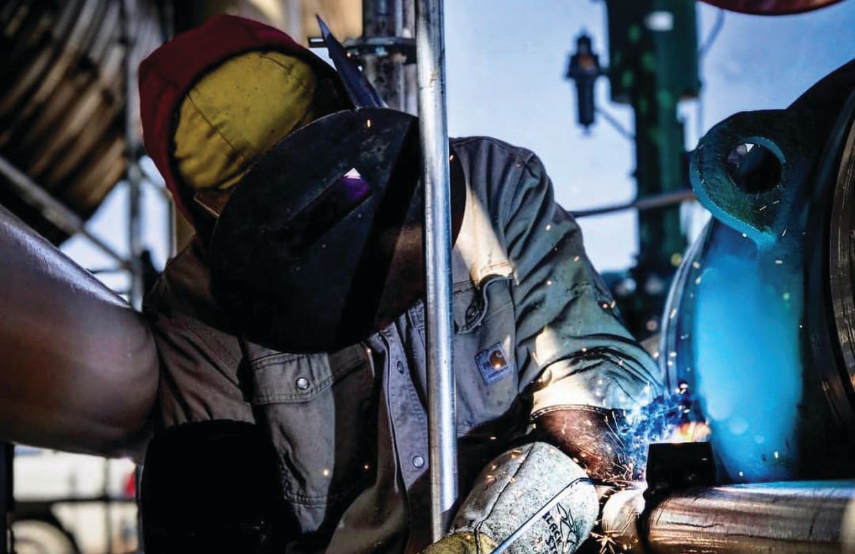 Fig 1 — A welder performs a service repair at a refinery facility. (Photo by Chase Buckler, AWS Photo Contest entry.)